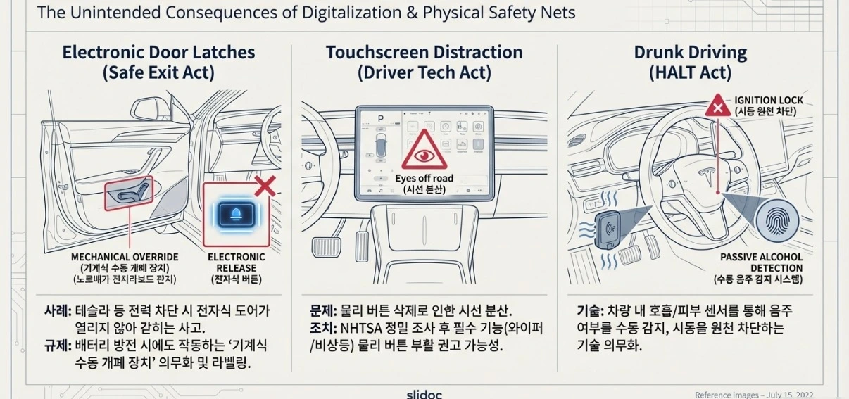 배터리가 방전되거나 위급한 상황에서도 탑승자가 직관적으로 문을 열고 탈출할 수 있도록 수동 개폐 장치를 의무화하고 눈에 띄는 라벨을 붙이게 합니다. 또한 와이퍼 조작처럼 중요한 기능을 화면 속에 숨겨두어 운전자의 시선을 뺏는 터치스크린 방식을 규제하고, 필요하다면 물리 버튼을 다시 살리는 방안도 검토합니다. 여기에 음주운전을 센서로 미리 감지해 사고를 원천 차단하는 기술까지 도입하여 기술에 따뜻한 안전장치를 더하고 있습니다.