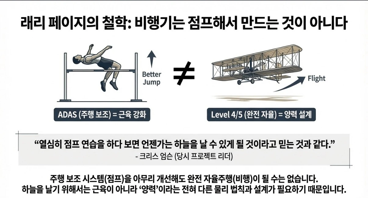 "기존의 방식은 주행 보조 시스템을 개선하다 보면 언젠가 자율주행이 될 것이라고 말합니다. 하지만 그것은 '열심히 점프 연습을 하다 보면 언젠가는 하늘을 날 수 있게 될 것'이라고 말하는 것과 같습니다."