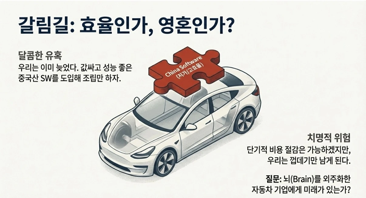 자동차의 정의가 '기계'에서 '움직이는 전자 기기(SDV)'로 바뀌는 시점입니다. 껍데기(하드웨어)는 제작사가 만들더라도, 그 뇌(자율주행 AI)를 중국 기술에 의존한다면 제작사는 단순한 '하청 조립 업체'로 전락하게 됩니다. 이는 곧 국내 자동차 산업 생태계 전체의 붕괴를 의미합니다.