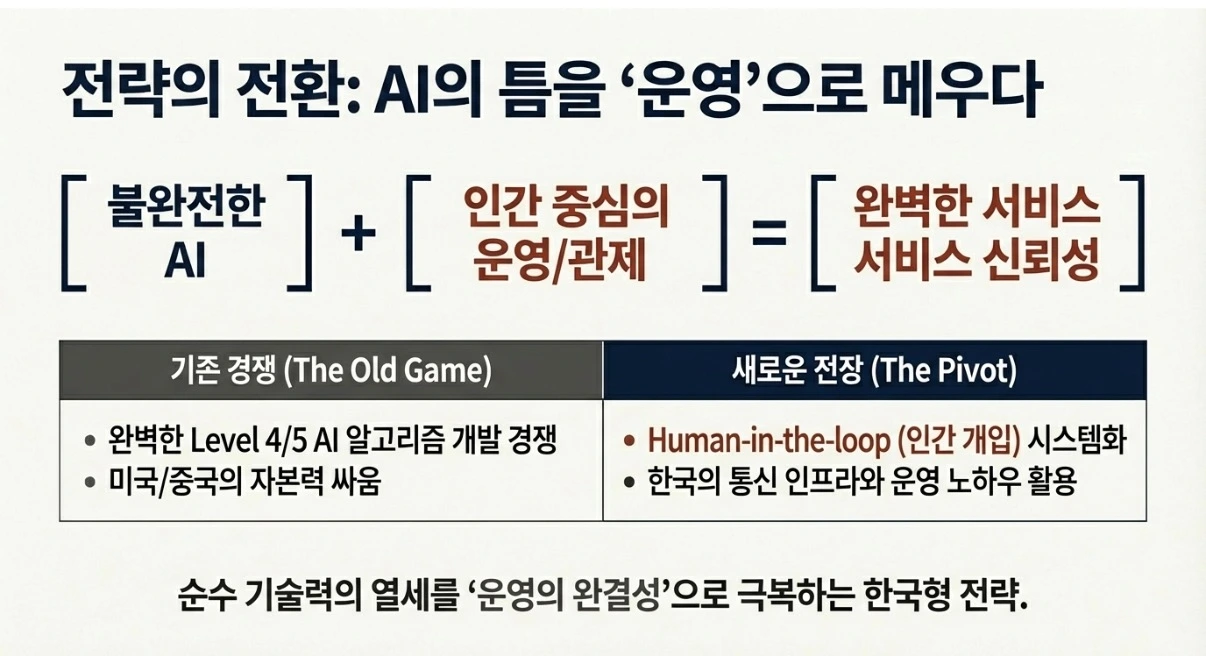 미국과 중국이 완벽한 AI(Level 4/5)를 위해 천문학적인 돈을 쏟아붓는 동안, 우리는 AI의 부족한 성능을 세계 최고의 통신 기술과 세심한 운영 역량으로 메우는 전략을 취할 수 있습니다.