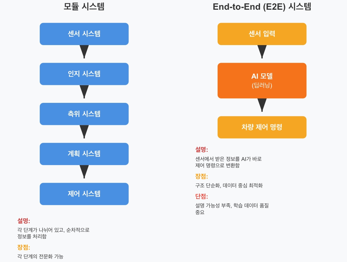 - 구조가 단순해요: 모듈 시스템처럼 여러 단계를 거치지 않고, 크게 엔드투엔드 시스템과 제어 시스템으로 나눌 수 있어 구조가 단순해집니다. 모듈 방식이 복잡성을 키우는 방향이라면, E2E는 데이터를 통해 단순한 구조를 개선합니다.