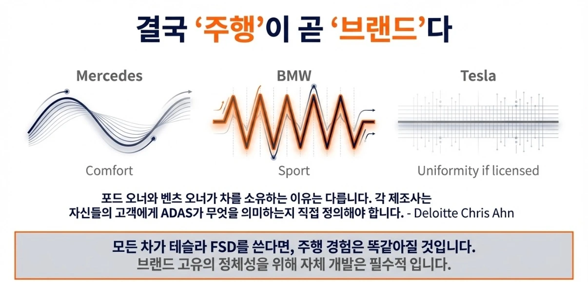 모든 차가 테슬라 FSD를 쓴다면, 벤츠를 타든 포드를 타든 주행 경험은 똑같아질 겁니다. 하지만 제조사들은 자율 주행 시대에도 우리 브랜드만의 승차감과 주행 철학(Brand Identity)을 지키고 싶어 합니다. A모델의 안락한 자율 주행과 B모델의 다이내믹한 자율 주행이 다르길 원하기 때문입니다.