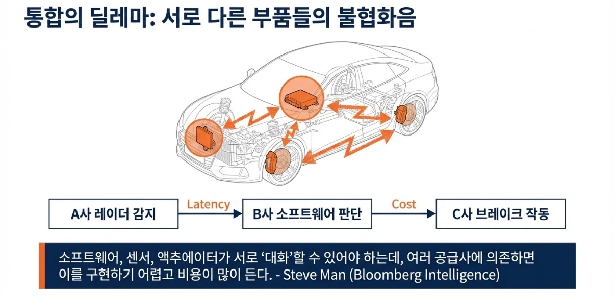 즉, 테슬라의 '최신 뇌'를 이식하기엔 기존 자동차의 '신경망'이 너무 구형이거나 호환되지 않는 것입니다. 이를 뜯어고치는 데만 수년이 걸리니, 차라리 "우리 몸에 맞는 뇌를 우리가 직접 만들자"는 결론에 도달하게 되는 것입니다.