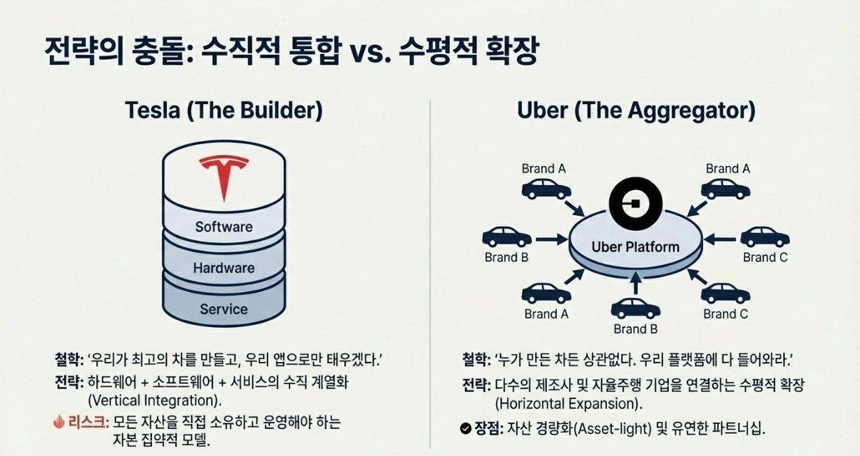 우버 (The Aggregator): "누가 만든 차든 상관없다. 우리 플랫폼에 다 들어와라." (수평적 확장)