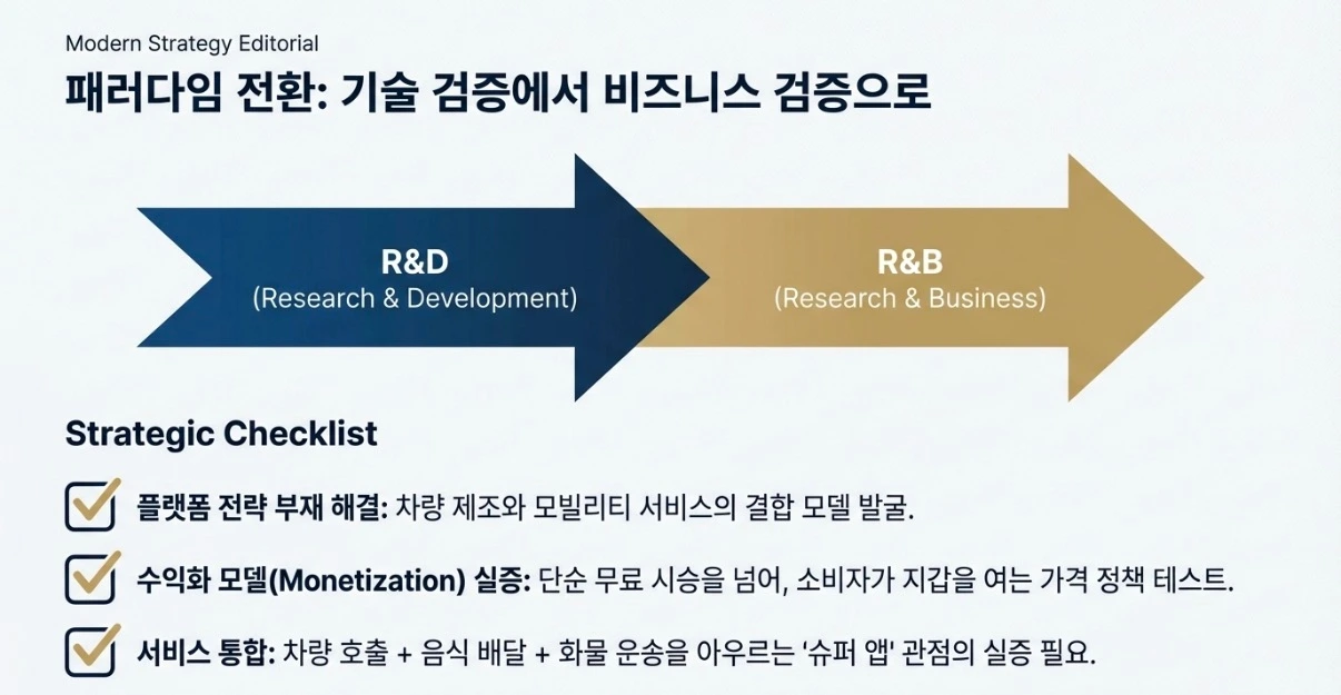 현재 한국의 실증 사업은 "차가 사고 없이 잘 굴러가는가?"(센서, 제어 기술)에 집중되어 있습니다. 물론 중요합니다. 하지만 우버의 사례가 보여주듯, 기술만으로는 시장을 장악할 수 없습니다.