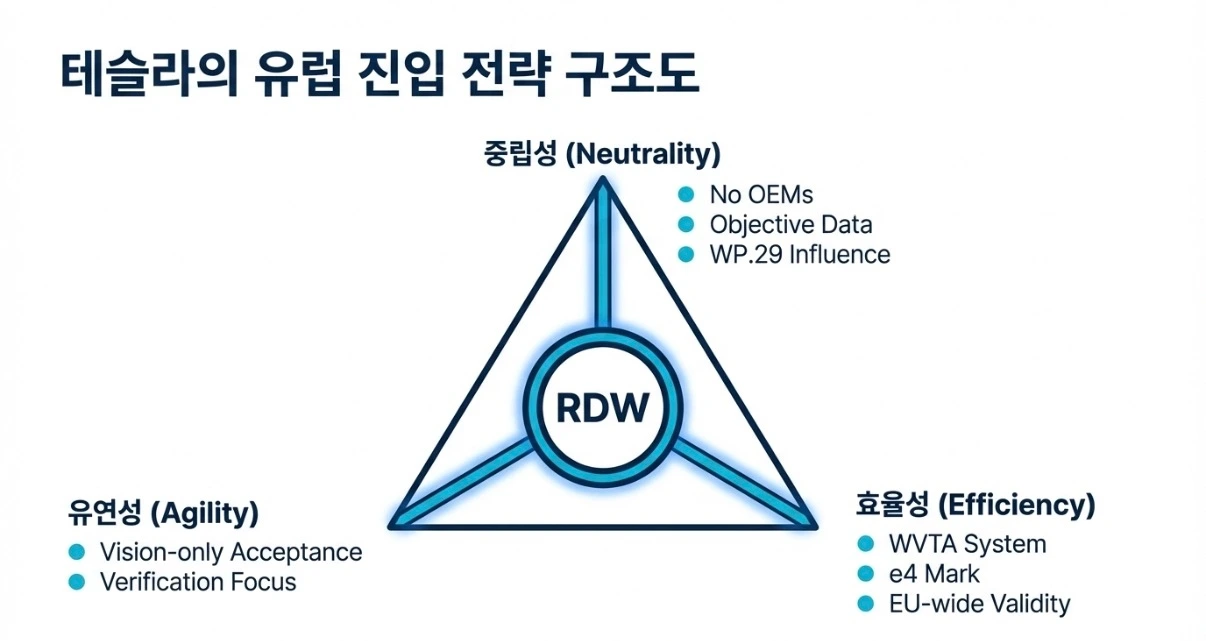 여기서 아주 흥미로운 대목이 있습니다. 기사는 테슬라의 유럽 승인 경로에 대해 다음과 같이 명시하고 있습니다.