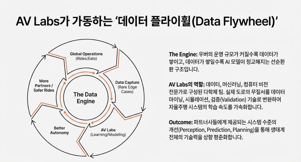 우버는 이제 이동 수단을 제공하는 회사를 넘어 전 세계 도시의 흐름을 안전하게 제어하는 운영체제로 진화하고 있습니다. 데이터가 쌓일수록 모델이 정교해지고, 모델이 좋아질수록 서비스가 안전해지는 데이터 플라이휠의 선순환 속에서 우리가 꿈꾸던 자율주행의 미래는 더욱 견고해질 것입니다.