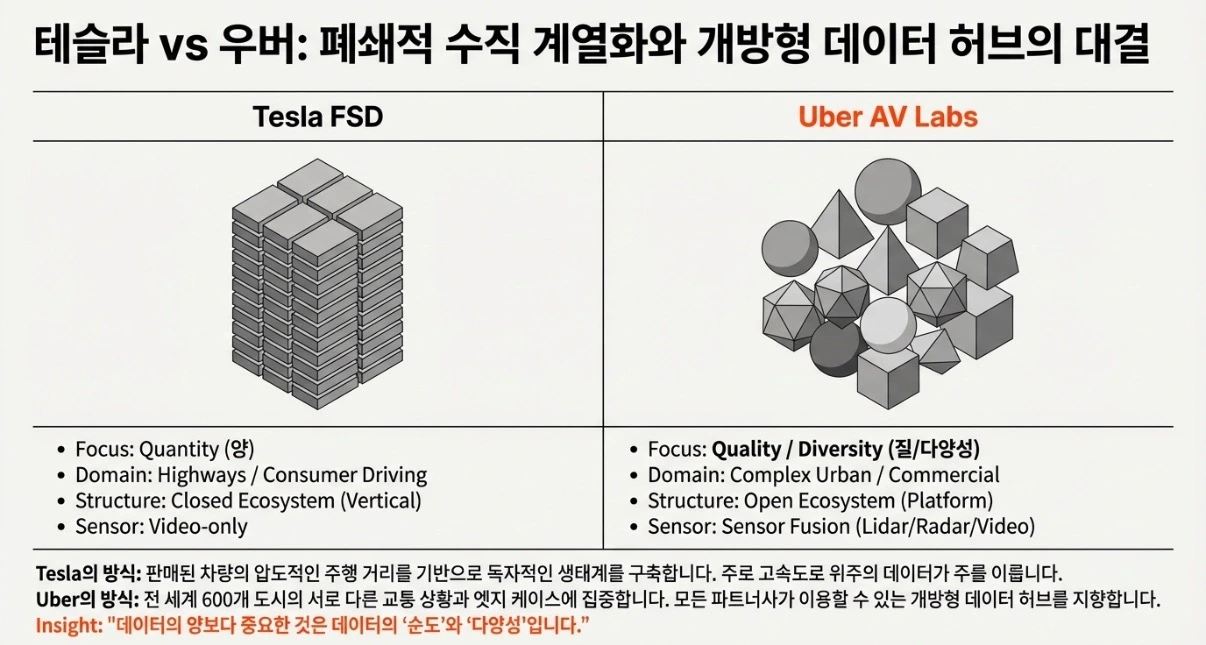 많은 이들이 우버의 행보를 테슬라의 FSD(Full Self-Driving) 전략과 비교합니다. 테슬라는 판매된 수백만 대의 차량에서 들어오는 압도적인 주행 거리와 데이터의 양을 강조하는 수직 계열화 방식을 고수합니다. 반면 우버의 AV Labs는 데이터의 양보다 다양성과 질에 집중합니다.
