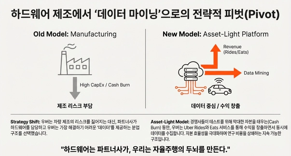 우버는 더 이상 자율주행차를 직접 제조하는 리스크를 짊어지지 않습니다. 대신 전 세계 600개 도시에서 운행되는 우버 차량을 실시간 데이터 수집 기지로 활용하는 전략을 택했습니다.