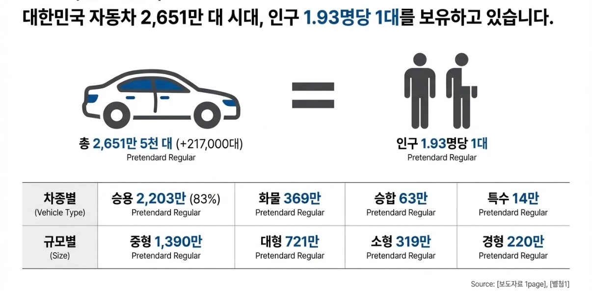 2026년 1월 29일, 국토교통부는 2025년 말 기준 자동차 등록현황을 발표했습니다. 이 자료에 따르면 우리나라의 자동차 누적 등록대수는 26,515,000대를 기록했습니다. 이는 전년 대비 0.8%인 21만 7천 대가 증가한 수치로, 인구 약 1.93명당 1대의 자동차를 보유한 셈입니다.