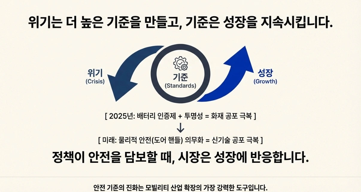 이러한 규제의 등장은 기술의 후퇴가 아니라, 인간 중심 안전 철학의 회복을 의미합니다. 2025년 우리가 배터리 인증제와 정보 공개를 통해 화재 공포를 극복하고 시장 성장을 이뤄냈듯, 앞으로 다가올 도어 핸들 등 신기술 관련 이슈들 또한 제도적 개선을 통해 해결될 것입니다.