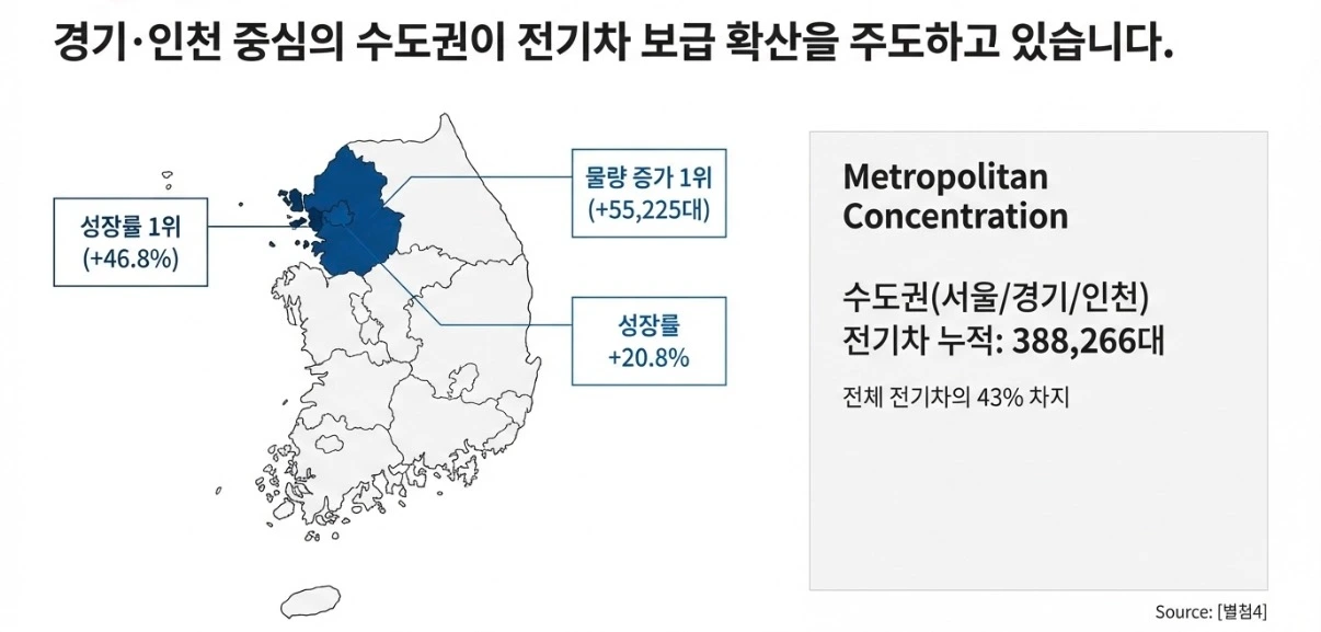 2025년 한 해 동안 신규 등록된 자동차는 총 1,695,000대였습니다. 이 중 전기차(EV)는 221,000대가 신규 등록되며 전체 신규 등록의 13%를 차지했습니다. 이는 전기차가 이제 얼리어답터의 전유물이 아니라 명실상부한 대중화 단계에 진입했음을 의미합니다.