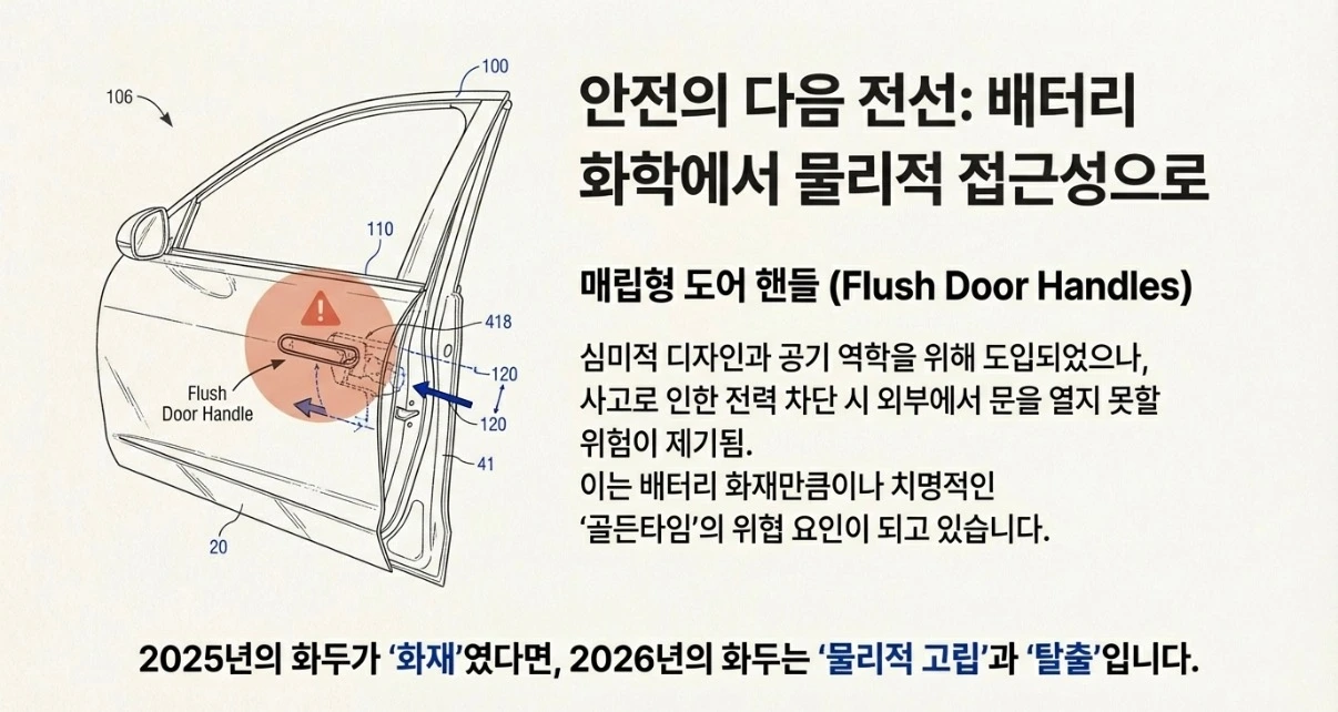 최근 전기차와 신차를 중심으로 매끈한 디자인과 공기 역학 효율을 위해 도입된 매립형 도어 핸들(플러시 핸들)에 대한 안전성 논의가 그 대표적인 예입니다. 전력 차단 시 문이 열리지 않아 골든타임을 놓칠 수 있다는 우려는 배터리 화재만큼이나 소비자들에게 큰 공포로 다가올 수 있는 문제입니다.