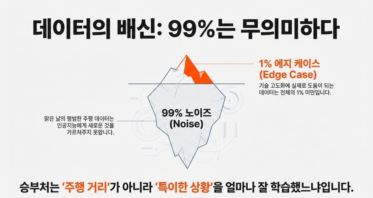 맑은 날 평범한 도로를 달린 데이터는 인공지능에게 새로운 것을 가르쳐주지 못합니다. 결국 승부처는 얼마나 많이 달렸느냐가 아니라 Edge Case라 불리는 1퍼센트의 특이한 상황을 얼마나 잘 골라내고 학습했느냐에 달려 있습니다.