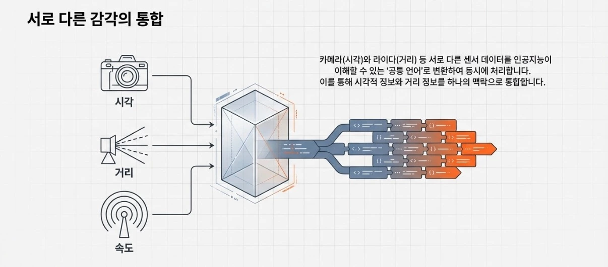 둘째로 멀티모달 토큰화입니다. 카메라와 라이다 등 서로 다른 센서 데이터를 인공지능이 이해할 수 있는 공통 언어로 변환하여 동시에 처리합니다. 이를 통해 시각적 정보와 거리 정보를 하나의 맥락으로 통합합니다.