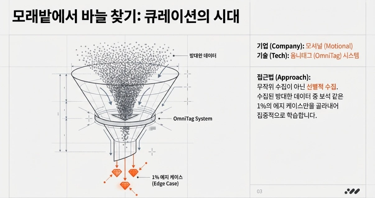 그동안 자율주행 기업들은 수집한 주행 거리의 양을 자랑해 왔습니다. 하지만 로보택시 기업 모셔널의 고백은 차가웠습니다. 수집된 주행 데이터 중 실제로 기술 고도화에 도움이 되는 것은 1퍼센트 미만이라는 사실입니다.