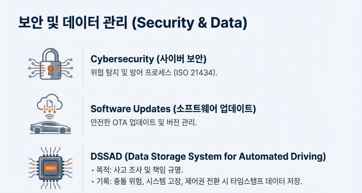 넷째, 운행 중 모니터링 및 보고(ISMR)와 자율주행 데이터 저장 시스템(DSSAD)을 통해 실시간 성능 보고와 사고 데이터 저장이 의무화됩니다.