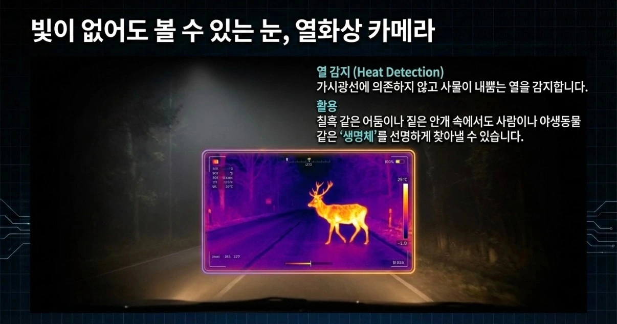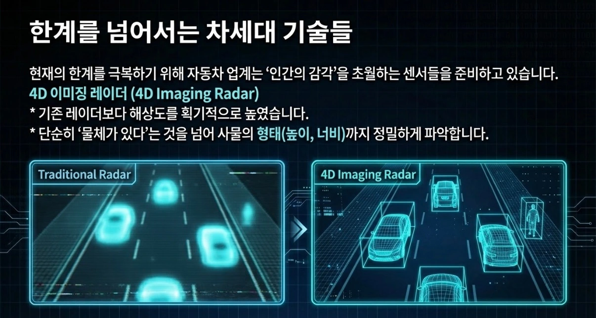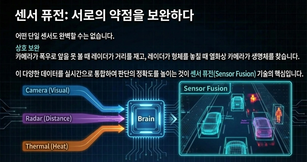 현재의 한계를 극복하기 위해 자동차 업계는 새로운 기술을 준비하고 있습니다. 4D 이미징 레이더는 기존 레이더보다 훨씬 정밀하게 사물의 형태를 파악합니다. 열화상 카메라는 빛이 전혀 없거나 안개가 자욱한 상황에서도 사물의 열을 감지해 생명체를 찾아냅니다. 또한 카메라가 못 보는 것을 레이더가 보완하는, 레이더가 헷갈리는 건 AI가 판단하는 방식으로 서로의 약점을 보완하는 Sensor Fusion 기술을 통해 판단의 정확도를 높이고 있습니다.