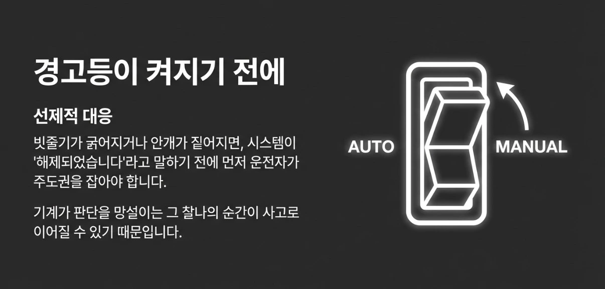 중요한 점은 ADAS는 자율주행이 아닌 보조 기능이라는 것입니다. 기상 조건이 나빠진다면 시스템이 경고를 보내기 전에 먼저 운전자가 주도권을 잡는 자세가 필요합니다.