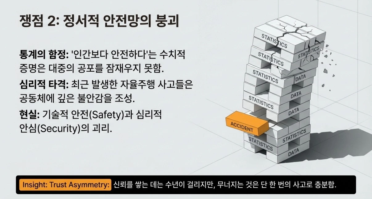 둘째는 정서적 안전망의 부재입니다. 최근 발생한 자율주행차 관련 사고들은 대중에게 깊은 불안감을 심어주었습니다. 통계적으로 인간보다 안전하다는 수치적 증명보다 중요한 것은, 단 한 번의 사고가 공동체에 미치는 심리적 타격입니다. 신뢰를 쌓는 데는 오랜 시간이 걸리지만 무너지는 것은 한순간임을 보여줍니다.