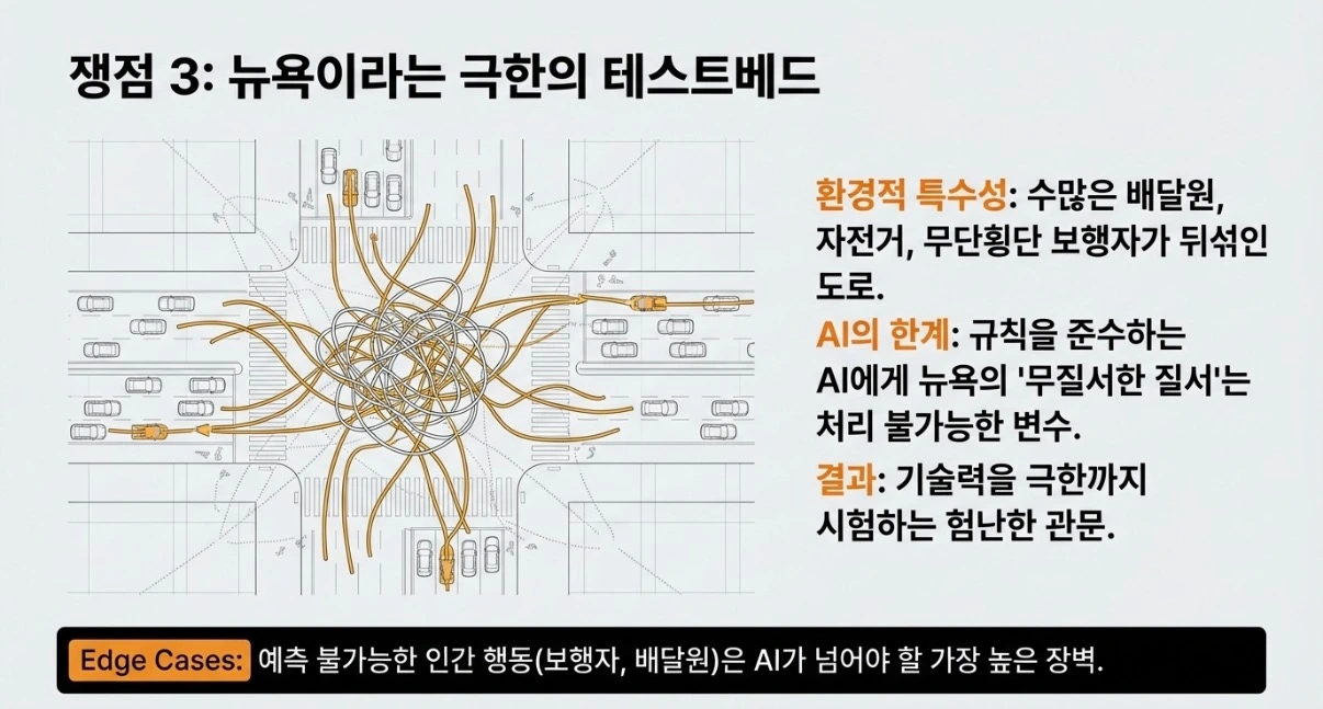 셋째는 뉴욕이라는 환경의 특수성입니다. 수많은 배달원과 자전거, 예측 불가능한 보행자들이 뒤섞인 뉴욕의 도로는 AI의 기술력을 극한까지 시험하는 가장 험난한 관문이나 다름없었습니다.
