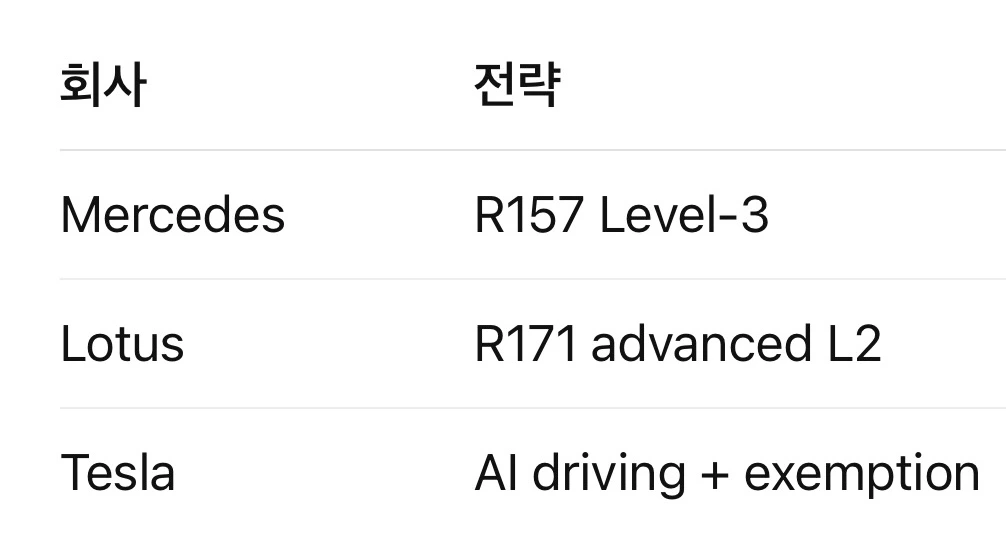 테슬라가 FSD라는 화려한 이름으로 미래를 선점하려 애쓰고, 메르세데스-벤츠가 Lv 3라는 기술적 고지를 선점하며 자존심을 지킬 때, 로터스는 전혀 다른 길을 택했습니다. 가장 현실적이고 영리한 방식인 R171이라는 규제의 틈을 파고든 것입니다.