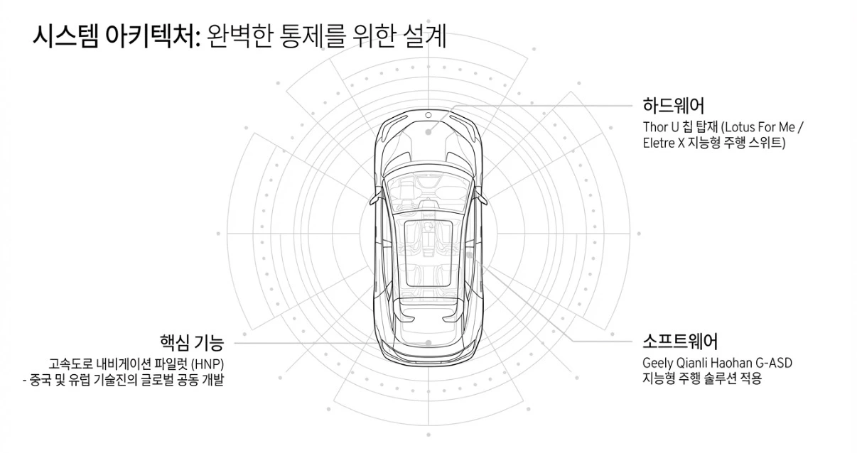 메르세데스가 고비용의 Lv. 3에 집중하고 테슬라가 규제 면제를 노리는 사이, 로터스는 Advanced Lv. 2라는 실리적 구간을 점령했습니다. Geely의 ‘천리안(Qianli Haohan) G-ASD' 솔루션을 기반으로 한 로터스의 전략은 명확합니다. 가장 높은 수준의 기술을 가장 안전한 규제 안에서 구현하는 것입니다.