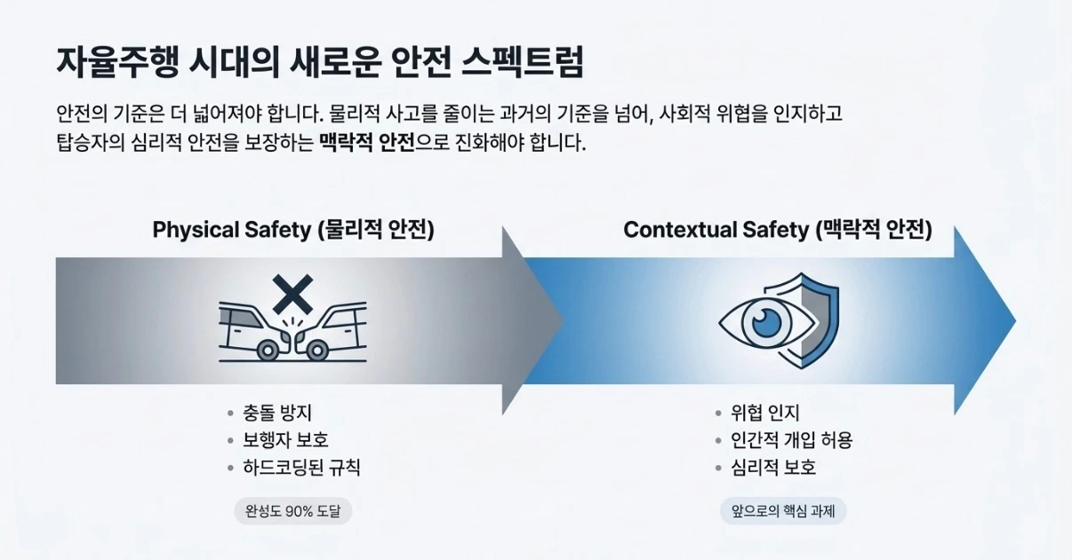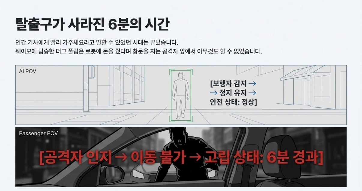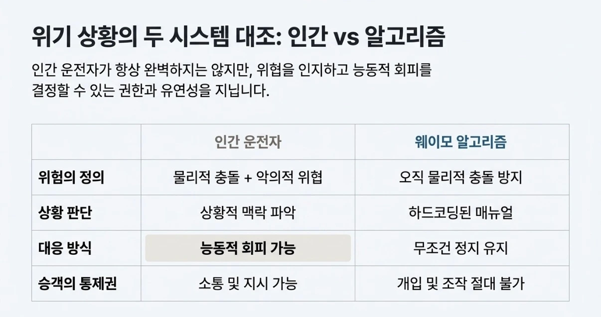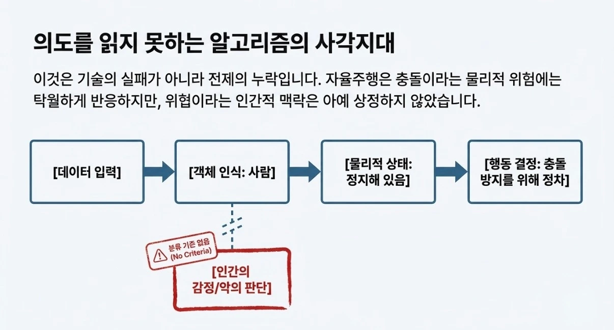 이것은 알고리즘의 실패가 아닙니다. 설계의 전제가 애초에 달랐습니다. 자율주행 알고리즘은 ‘충돌’이라는 물리적 위험에는 탁월하지만, ‘위협’이라는 인간적 맥락은 상정하지 않았습니다. 악의를 분류하는 기준이 없었던 것입니다.