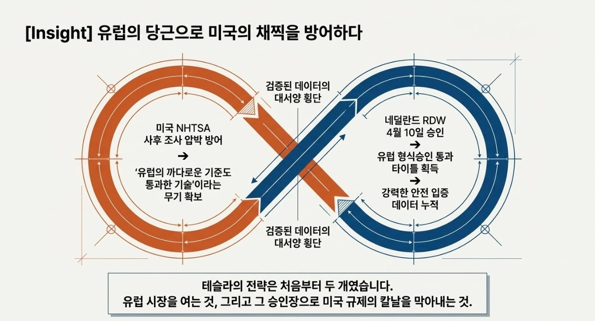 유럽의 국가별 확산이 향하는 곳은 유럽 소비자만이 아닙니다. 미국 NHTSA의 조사 테이블 위이기도 합니다. 유럽의 형식승인을 통과했다는 기록이, 사후 조사 압박에 대한 방어 근거가 됩니다.