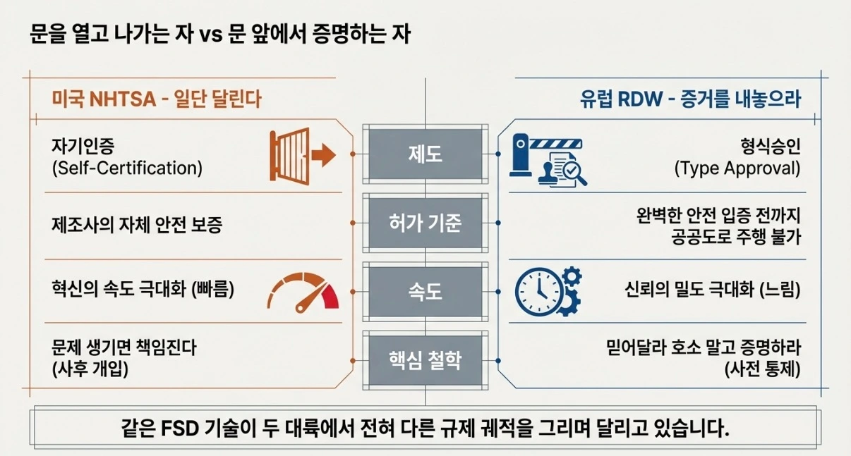 유럽은 반대입니다. ’ 형식승인(Type Approval)’이 도로 앞을 먼저 가로막습니다. 안전함을 입증하기 전까지, 공공도로에 코드 한 줄도 올릴 수 없습니다. “믿어달라”는 호소 대신 “증거를 내놓으라”는 요구가 기준입니다.