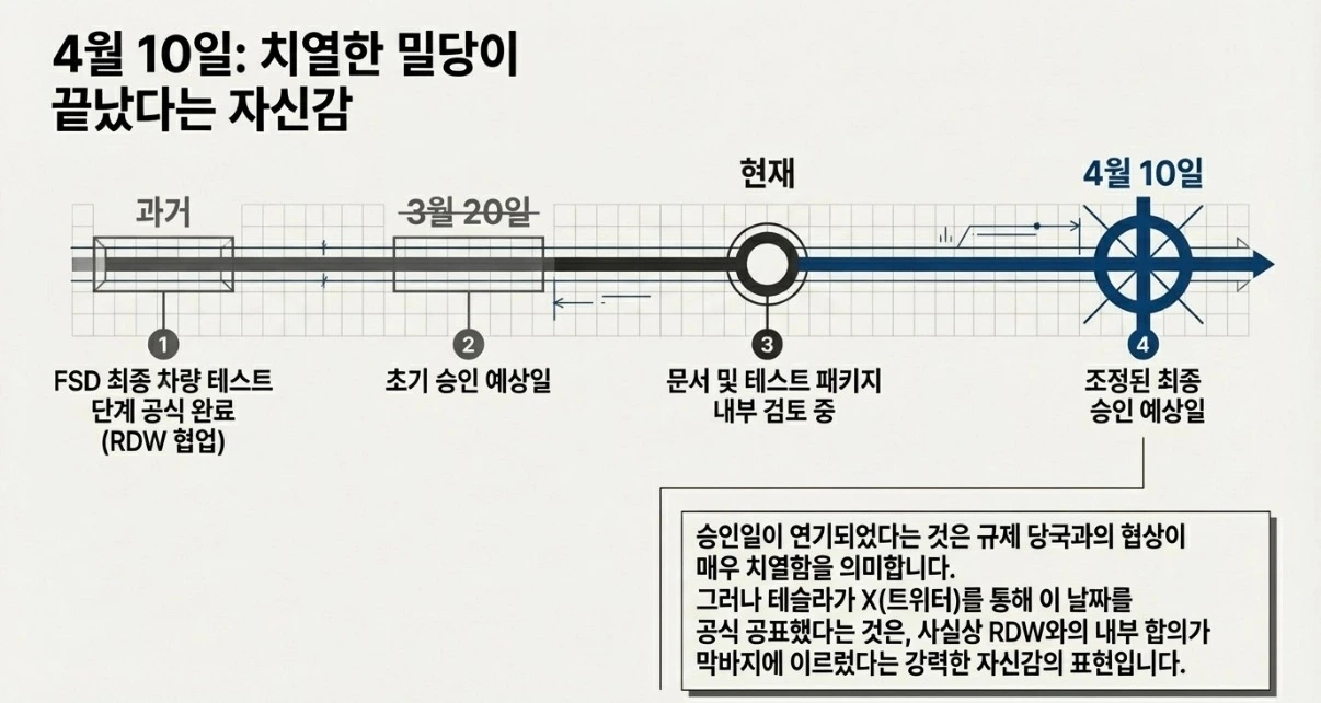 승인 예정일은 4월 10일입니다. RDW가 승인을 내리면, EU 상호 인정 원칙에 따라 독일·프랑스로의 확산이 뒤따르도록 테슬라는 노력하겠죠.