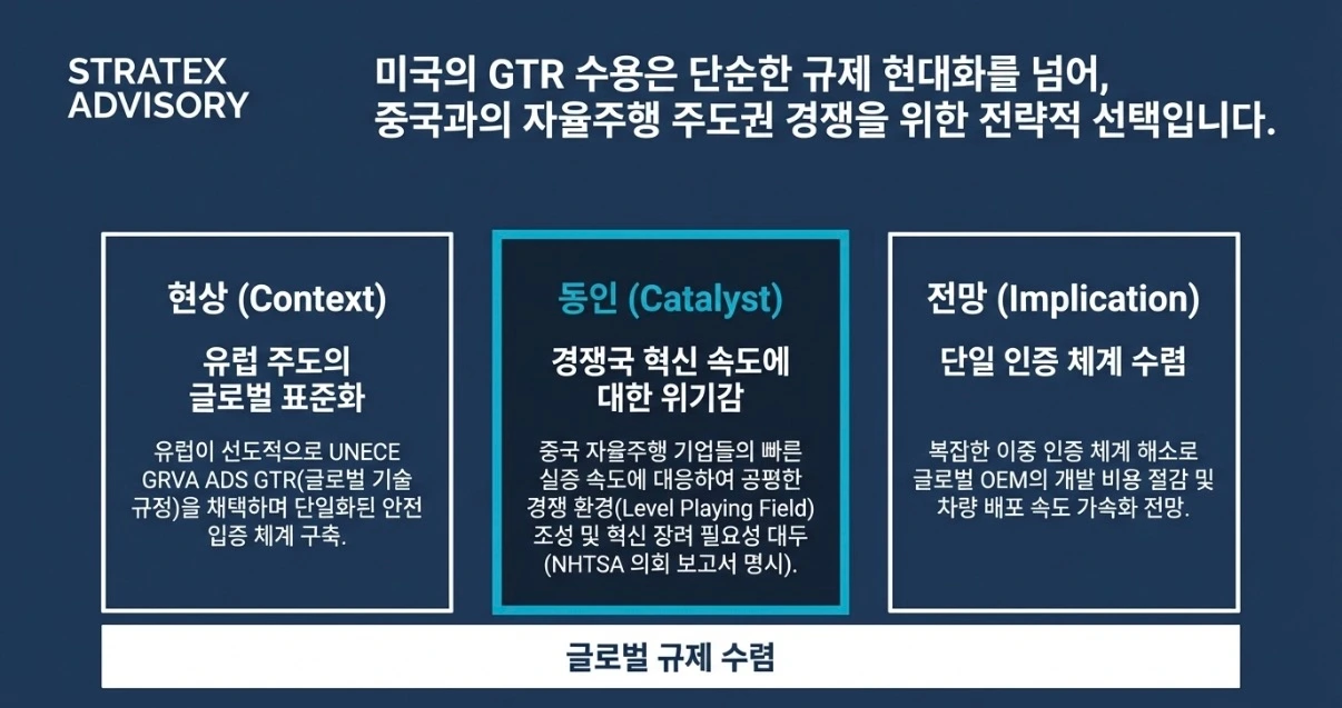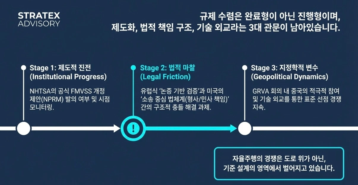 자율주행의 경쟁은 도로 위에서만 벌어지지 않습니다. 기준을 누가 먼저 설계하느냐에서도 벌어지고 있습니다.