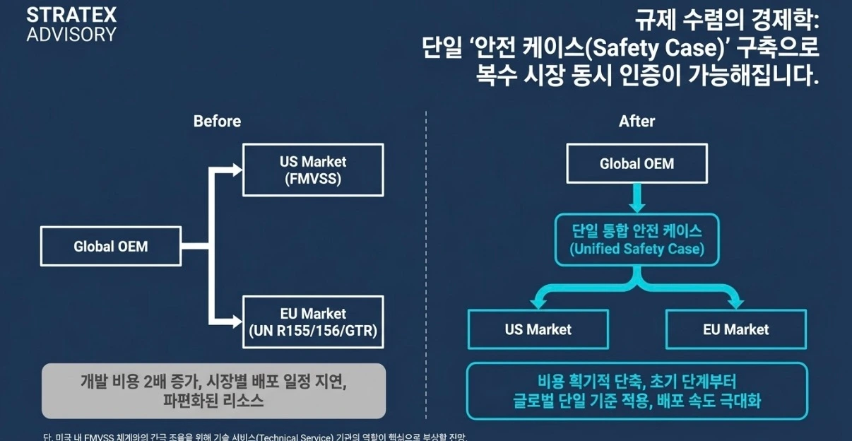 우리가 구매할 다음 차에 자율주행 기능이 들어간다면, 그 기능이 어느 기준으로 개발되고 인증됐는지가 실제 안전 수준을 결정합니다. 지금까지는 유럽 시장과 미국 시장에 각각 다른 기준으로 인증을 받아야 합니다. 글로벌 OEM 입장에서는 비용이 두 배로 들고, 개발 일정도 분리됩니다.