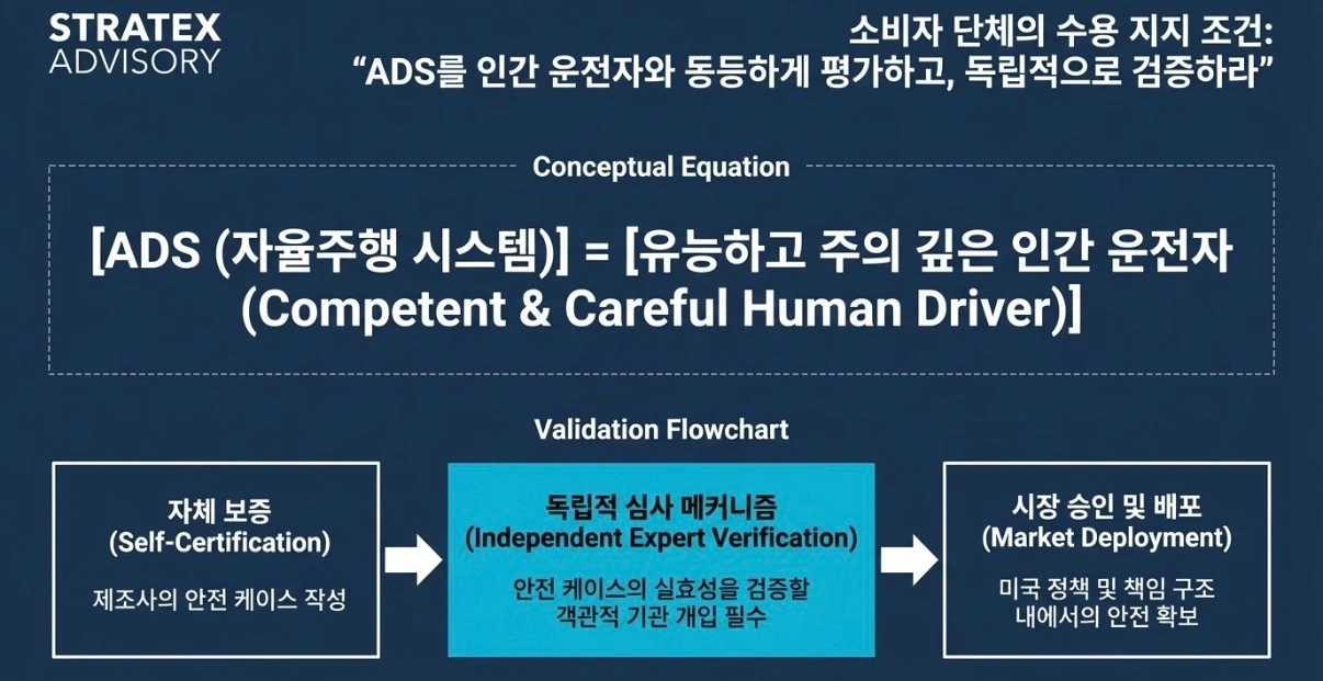 컨슈머 리포츠가 NHTSA에 제출한 의견서도 같은 흐름입니다. NHTSA가 ADS GTR의 기술적 타당성과 미국 정책과의 연관성을 검토하는 과정에서 의견을 요청하자, 컨슈머 리포츠는 2026년 2월 23일 공식 의견서를 제출했습니다 (Docket No. NHTSA-2026-0034).