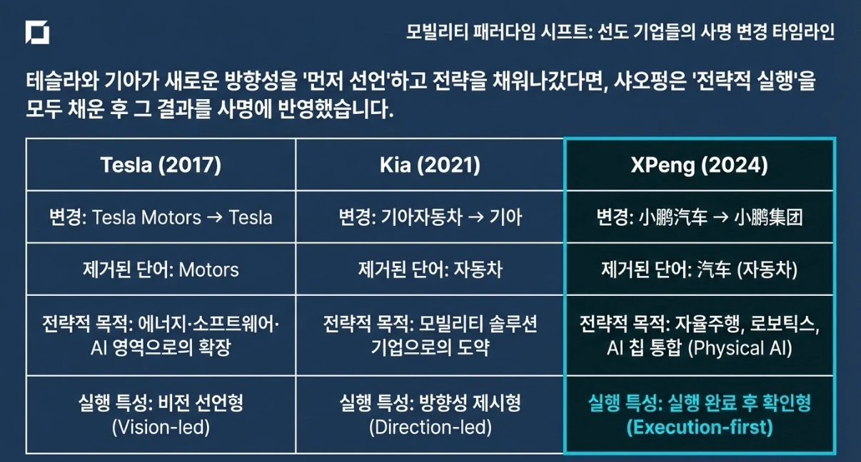 그리고 한 가지 점에서 앞선 두 사례보다 더 흥미롭습니다. 기아와 테슬라가 먼저 이름을 바꾸고 전략을 채웠다면, 샤오펑은 전략을 먼저 채우고 이름을 바꿨습니다.