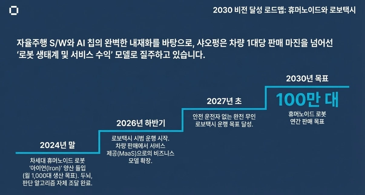 2026년 하반기에는 로보택시 시범 운행이 예정됩니다. 2027년 초 목표는 안전 운전자 없는 완전 무인 운행입니다. 이 일정이 실현된다면, 샤오펑은 차량 판매 마진이 아닌 서비스 수익으로 먹고사는 첫 번째 중국 자동차 기업이 됩니다.