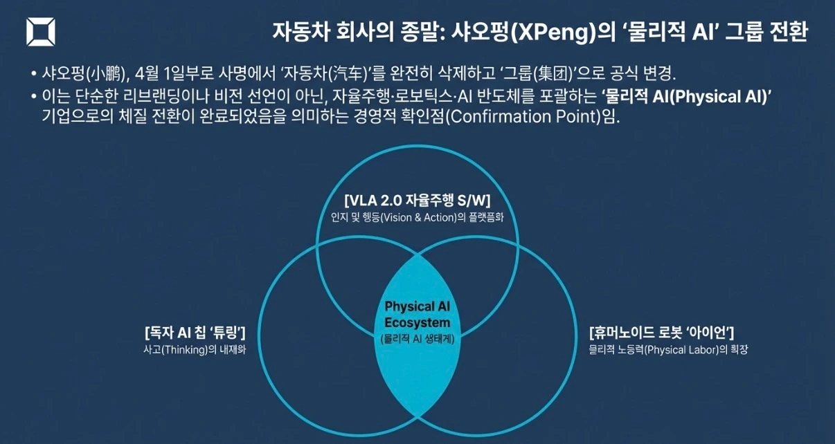 샤오펑(小鹏)은 4월 1일부로 중국어 사명을 ‘小鹏汽车’에서 ‘小鹏集团’으로 바꿉니다. 지워진 ‘汽车’는 자동차를 뜻하고, 들어온 ‘集团’은 그룹을 뜻합니다. 변경은 두 글자지만, 선언은 하나입니다. 이 회사는 더 이상 자동차를 만드는 회사가 아닙니다.