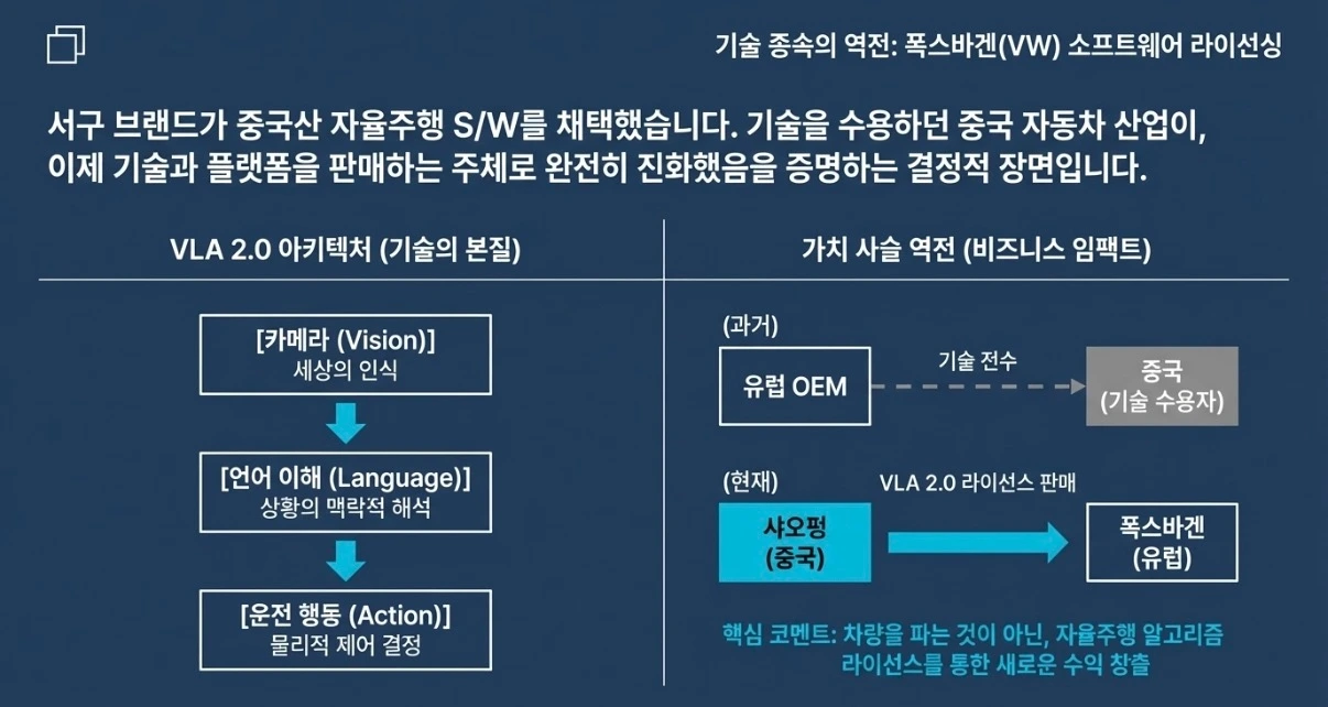 중국 자동차 산업은 오랫동안 유럽 기술을 배우는 위치에 있었습니다. 그 흐름이 이번에 방향을 바꿨습니다. 유럽 OEM이 중국 소프트웨어에 라이선스 비용을 지불합니다.