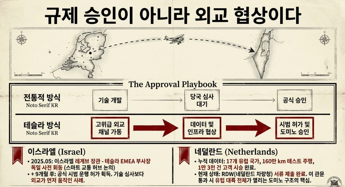 이스라엘의 경우, 2025년 5월 독일에서 레게브 장관과 테슬라 EMEA 부사장이 먼저 만났습니다. 스마트 교통 허브 설립 가능성까지 논의했고, 그로부터 9개월 후 2월에 공식 시범 운행 허가가 났습니다. 외교 채널이 규제 승인보다 먼저 움직인 것입니다.