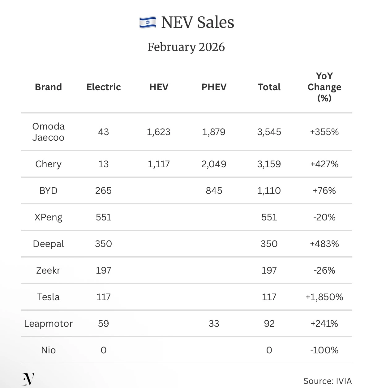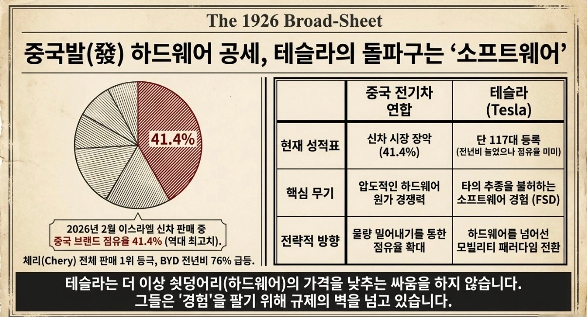 동시에 이스라엘 자동차 시장의 현실을 봐야 합니다. 2026년 2월 기준, 중국 브랜드는 이스라엘 전체 신차 판매의 41.4%를 차지했습니다. 역대 최고치입니다. 체리의 오모다·자이쿠가 처음으로 전체 판매 1위에 올랐고, BYD는 전년 대비 76% 급등했습니다.