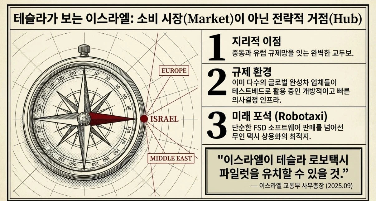 테슬라가 보는 이스라엘은 시장이 아니라 거점입니다. 중동과 유럽을 잇는 지리적 위치, 기술 친화적 정부, 빠른 규제 결정 구조가 맞물린 테스트베드. 이스라엘에서 쌓은 데이터와 레퍼런스가 향후 더 큰 시장의 진입 근거로 쓰입니다.