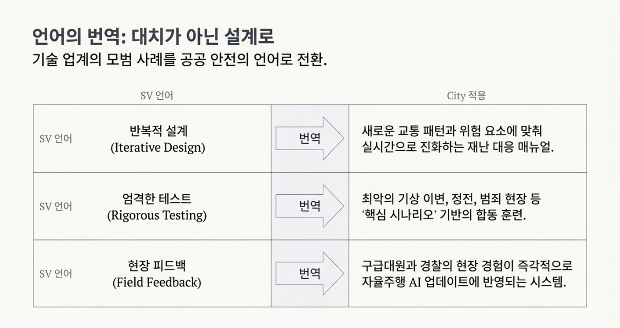 이 균형을 실현하는 방법은 하나입니다. 기술 기업과 도시 행정이 서로를 적으로 대하지 않는 것. 반복적 설계, 엄격한 테스트, 현장 피드백이라는 기술 업계의 모범 사례를 공공 안전의 언어로 함께 번역하는 것.
