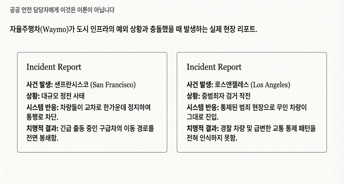 샌프란시스코에서는 정전이 발생하자 Waymo 차량들이 교차로 한가운데 멈춰섰습니다. 구급차는 그 사이를 뚫고 지나가야 했습니다. 로스앤젤레스에서는 무인 차량이 중범죄자 검거 현장으로 진입했습니다. 경찰 차량도, 변화된 교통 패턴도 인식하지 못한 채로.