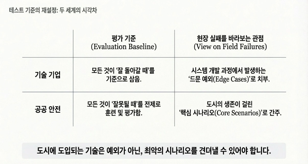 소방청장이나 경찰청장이 훈련받는 방식은 하나입니다. 아무것도 계획대로 되지 않는다는 전제에서 출발하는 것. 도시에 도입되는 모든 기술은 모든 것이 잘 돌아갈 때가 아니라, 모든 것이 잘못될 때를 기준으로 평가받아야 합니다.