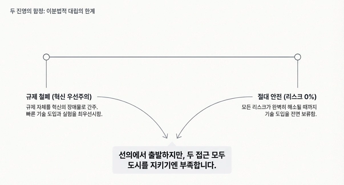 자율주행차를 어떻게 받아들일 것인가. 이 물음을 두고 세상은 여전히 두 진영으로 나뉩니다. 한쪽은 규제 자체를 혁신의 장애물로 봅니다. 다른 쪽은 모든 리스크가 해소될 때까지 기다려야 한다고 말합니다. 두 입장 모두 선의에서 출발하지만, 둘 다 도시를 지키기엔 부족합니다.