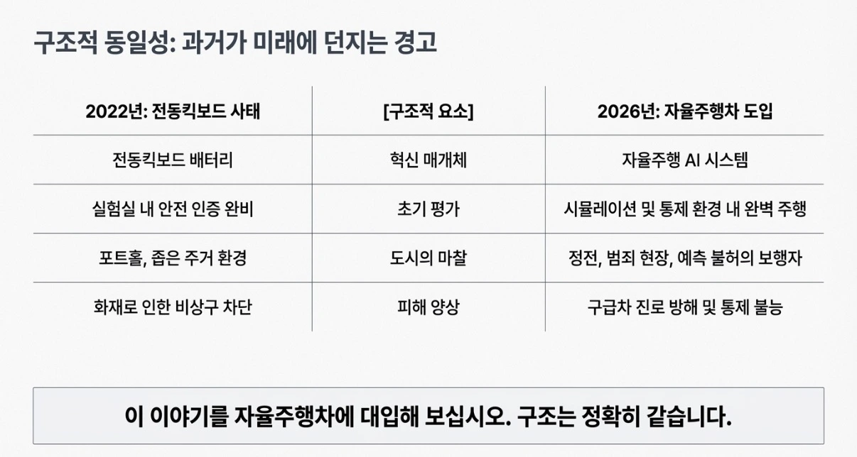 새로운 기술을 거부하자는 게 아닙니다. 이동성 혁신을 허용하는 도시 인프라는 제조업, 일자리, 서비스 방식을 바꿉니다. 문제는 그 혁신이 위기를 만난 뒤에야 안전을 붙들려 한다는 점입니다.