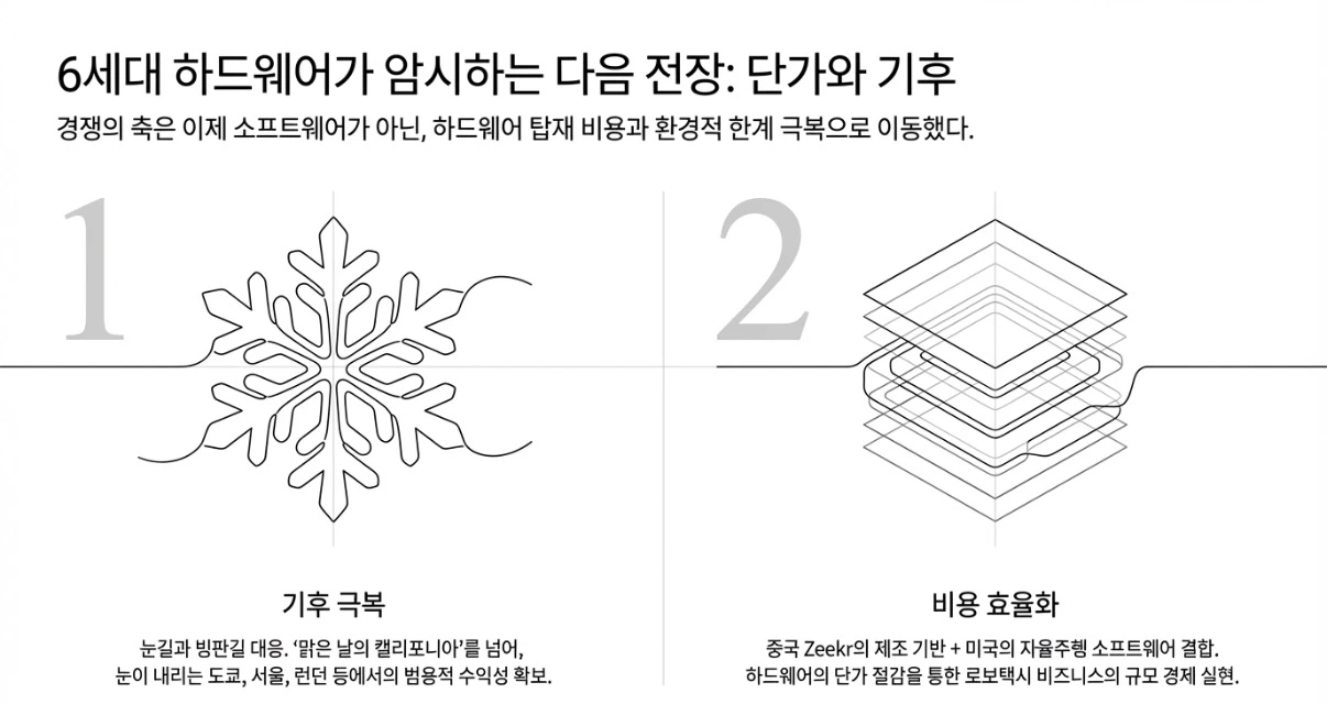 현재 도쿄에서 달리는 웨이모 차량은 5세대 하드웨어를 탑재하고 있습니다. 6세대 개발은 이미 시작됐습니다. 두 가지 방향에 초점이 맞춰져 있다고 합니다. 눈길·빙판길 대응, 그리고 하드웨어 비용 절감입니다.