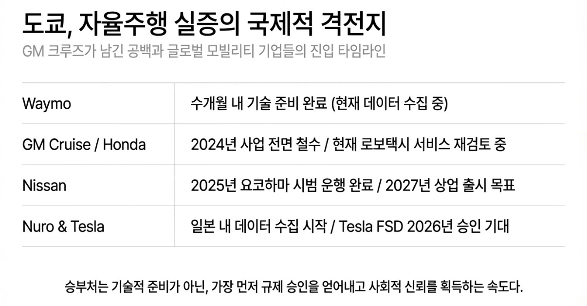 2024년 12월, GM은 Cruise의 로보택시 사업을 전면 철수했습니다. 치열한 경쟁과 높은 비용이 이유였습니다. 혼다는 GM·Cruise와 손잡고 2026년 초 도쿄 중심부 서비스 출시를 계획하고 있었습니다. 그 계획은 한 번에 무너졌습니다.