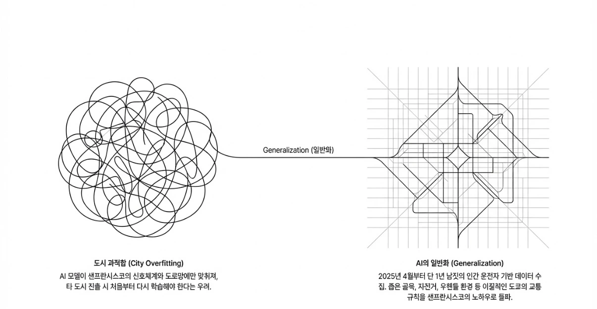 AI 모델이 샌프란시스코 데이터에만 너무 정교하게 맞춰져 있어서, 다른 도시에 가면 처음부터 다시 학습해야 한다는 것이었습니다. 교통 신호 배치가 다르고, 차선 폭이 다르고, 운전 문화가 다르면, 핵심 모델은 이식되지 않고 현지에서 새로 구워야 한다는 논리였습니다.