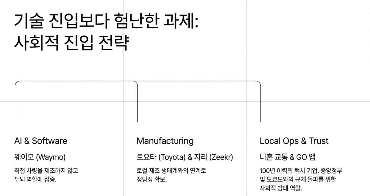 일본의 자율주행 관련 허가는 미국과 마찬가지로 중앙정부와 도쿄도 양측 모두와 협력해야 합니다. 토요타와의 협력 가능성 언급은 이 맥락에서 읽혀야 합니다. 현지 제조 생태계와의 연계는, 외국 기업이 일본 규제 환경에서 정당성을 확보하는 가장 효과적인 경로 중 하나입니다.